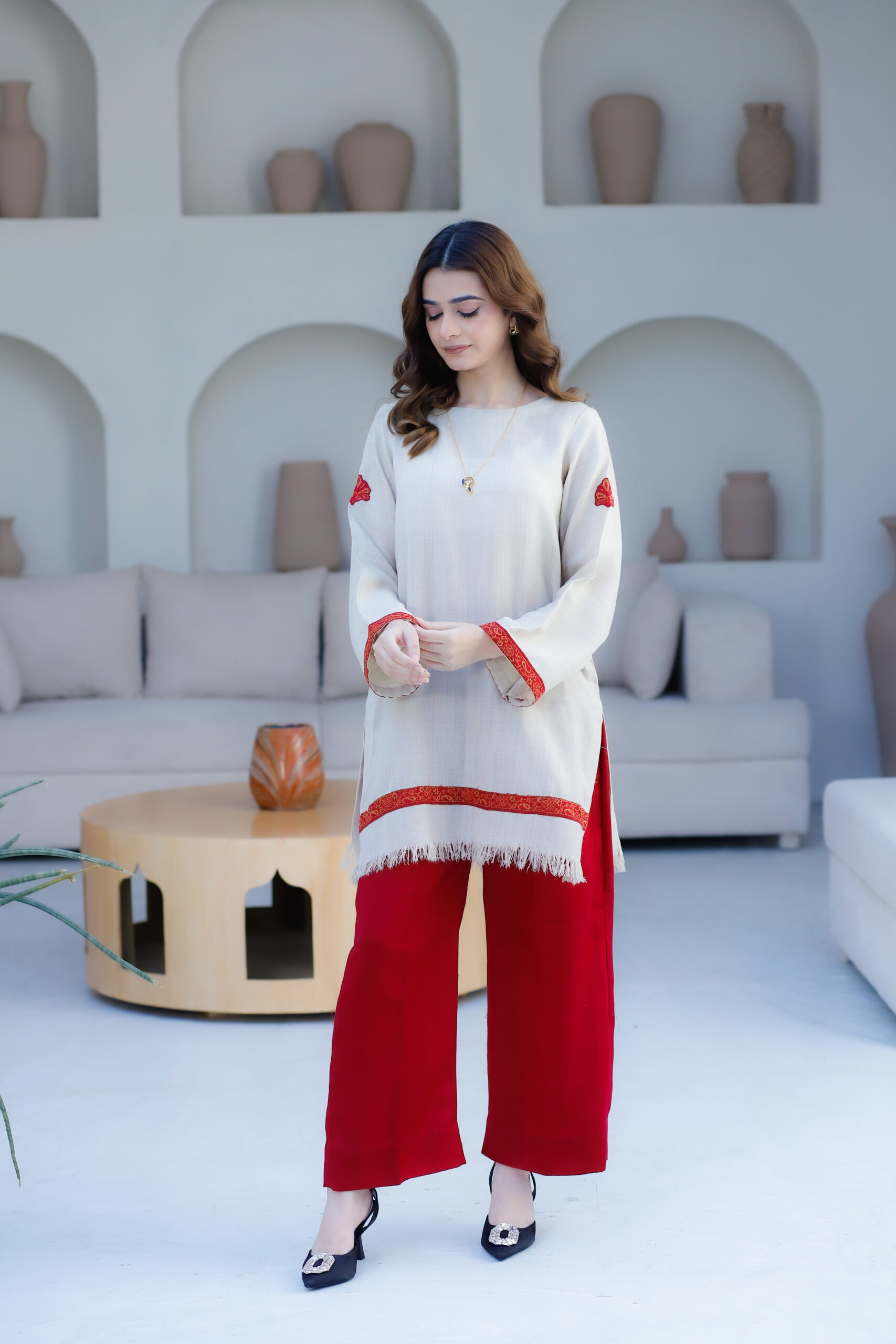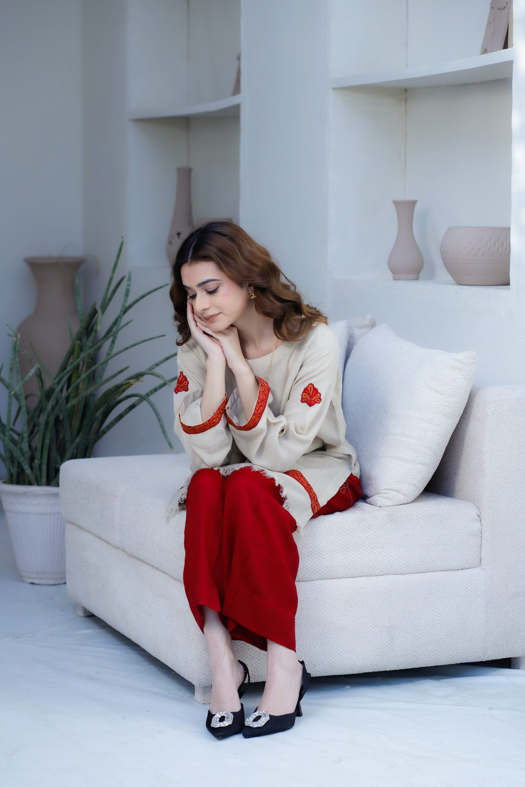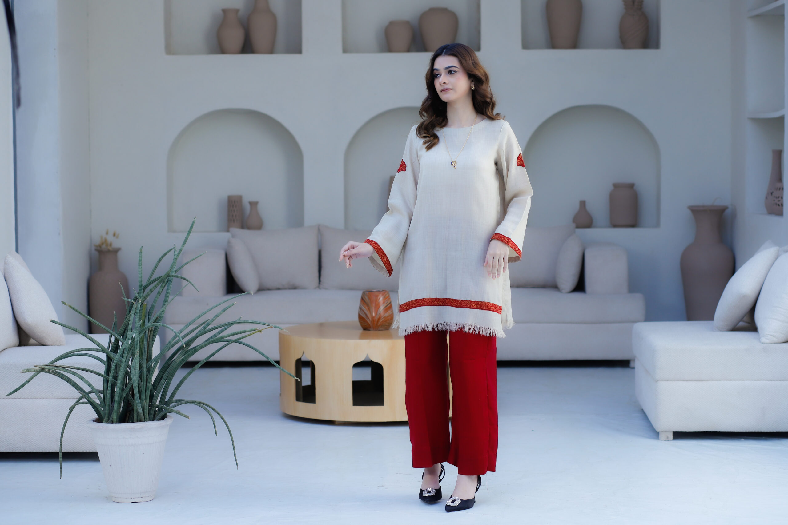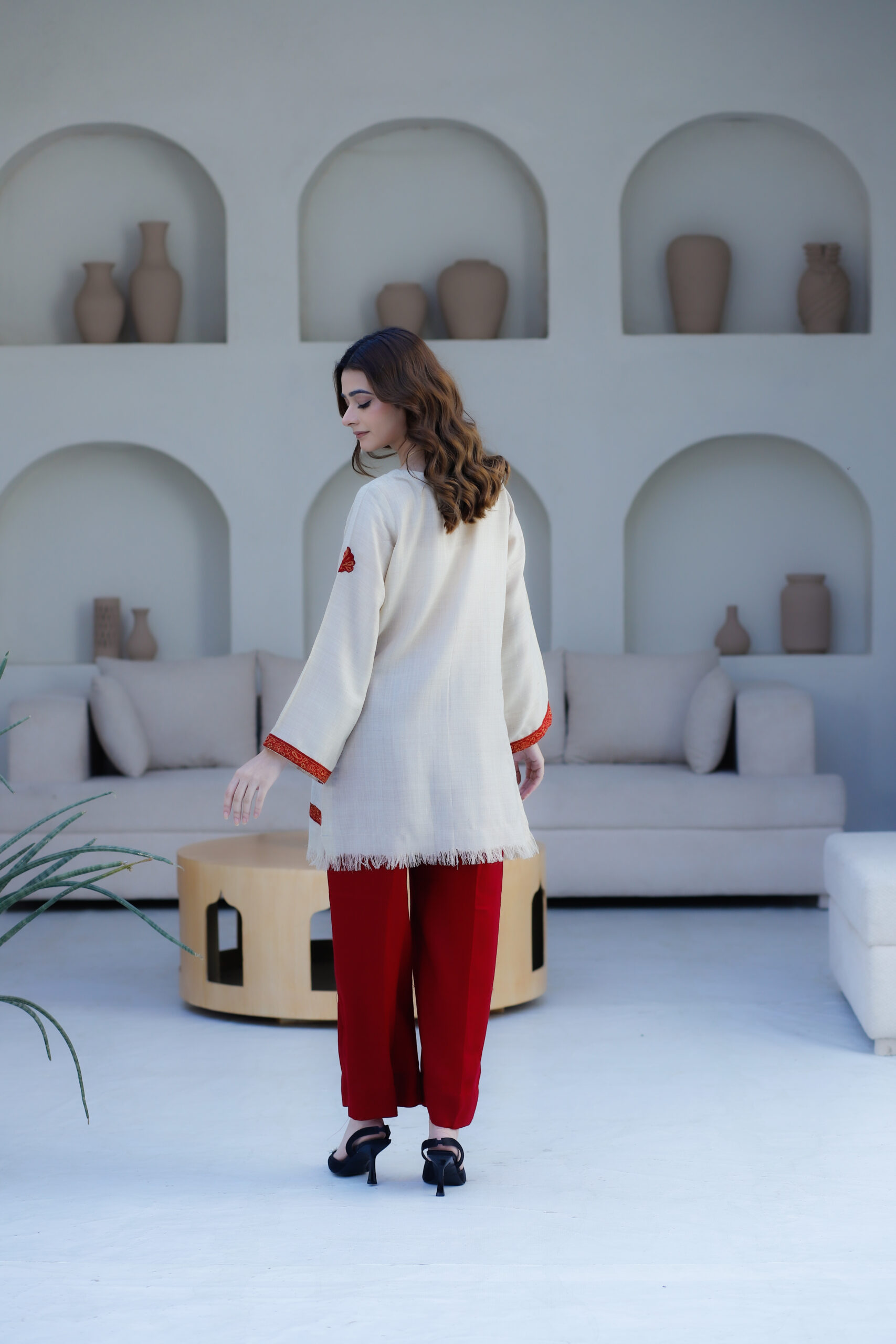 The outfit is defined by its artistic contrasts—delicate crimson embroidered accents the sleeves and shoulders, while the cuffs are finished with a rich red border. A raw-fringe hemline adds a touch of bohemian flair, perfectly balanced by the structured elegance of the deep red wide-leg trousers. Sophisticated, comfortable, and effortlessly chic.